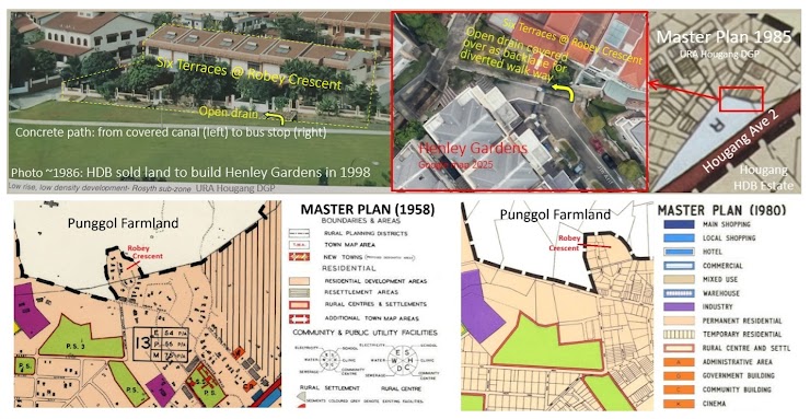 In the early 1980s, two rows of six terraces were developed by the late Koh Peng Hai. The main access road through Robey Crescent (with sidewalks and drains) was surrendered to the State for maintenance (see photo in section 1). As reported by Mothership on 9 Dec 2025, Mr. Koh was a leader of Teochew Poit Ip Huay Kuan and the Upper Serangoon Citizens’ Consultantive Committee. He was conferred the Public Service Star (Bar) in 1992 and passed away in 2002. At the back of each of these terraces is a back gate for egress and to maintain an open drain that collects surface runoff from the terraces. In 2013, the leftover land to one side of Robey Cresent was sold at $210 psf to the owners of the terraces. The leftover land on the other side, adjacent to the remnant land (marked R in Section 1, Master Plan 1985) is the subject of the news.