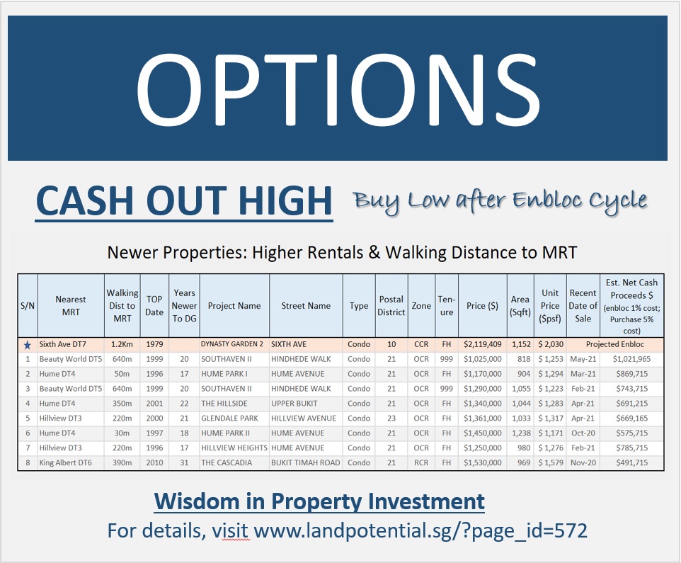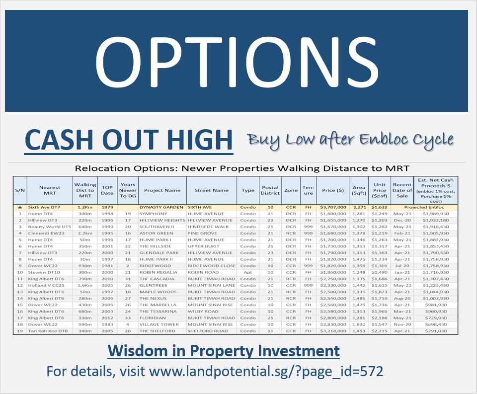 Relocation Options: Newer Properties Walking Distance to MRT( Strategy: Sell Now Buy Later, After Enbloc Cycle )
